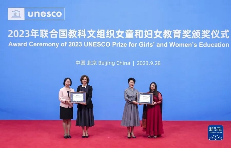 彭丽媛出席2023年联合国教科文组织女童和妇女教育奖颁奖仪式